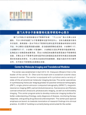 厦 门大学分子影像暨转化医学研究中心组建于2012年4月,目标为建成面向海内外开放的、具有国际一流水平的分子影像学及转化医学创新基地和国际化研究平 台。中心配有PET/CT、SPECT/CT、9.4T高场MRI、多光谱光声断层成像、生物发光活体成像、荧光活体成像及超声成像系统等高端小动物影像 设备,拥有放射性药物实验室和分子生物学实验室,开展立足分子影像学及转化医学前沿的基础及临床前研究和满足国家战略需求的高新技术研究。已经动工建设的 约4000平方米的分子影像大楼将用于建设小动物成像平台、放射性药物研究平台、分子细胞生物学平台和纳米医学平台,同时安装回旋加速器并建设符合药 品 GMP要求的放射性药物研发洁净区,提供64Cu和124I等固体靶核素及其制剂。