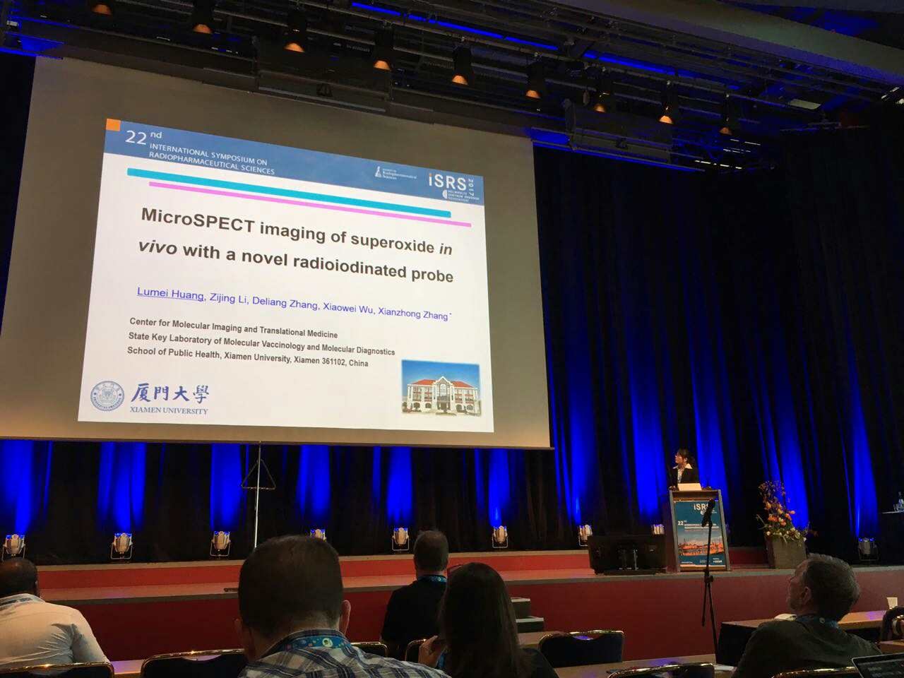 “国际放射性药物科学大会”为放射性药物研究领域的顶级盛会,每两年召开一次,来自世界各地的参会人数约800人。我中心张现忠教授带领三位研究生参加了本次会议,并通过口头报告和壁报方式展示4项最新研究成果。其中黄路梅同学在大会上口头报告的“MicroSPECT imaging of superoxide in vivo with a novel radioiodinated probe”引起热烈关注,报告之后即有来自美国耶鲁大学和德国Helmholtz-Zentrum Dresden-Rossendorf研究所的同行寻求合作。