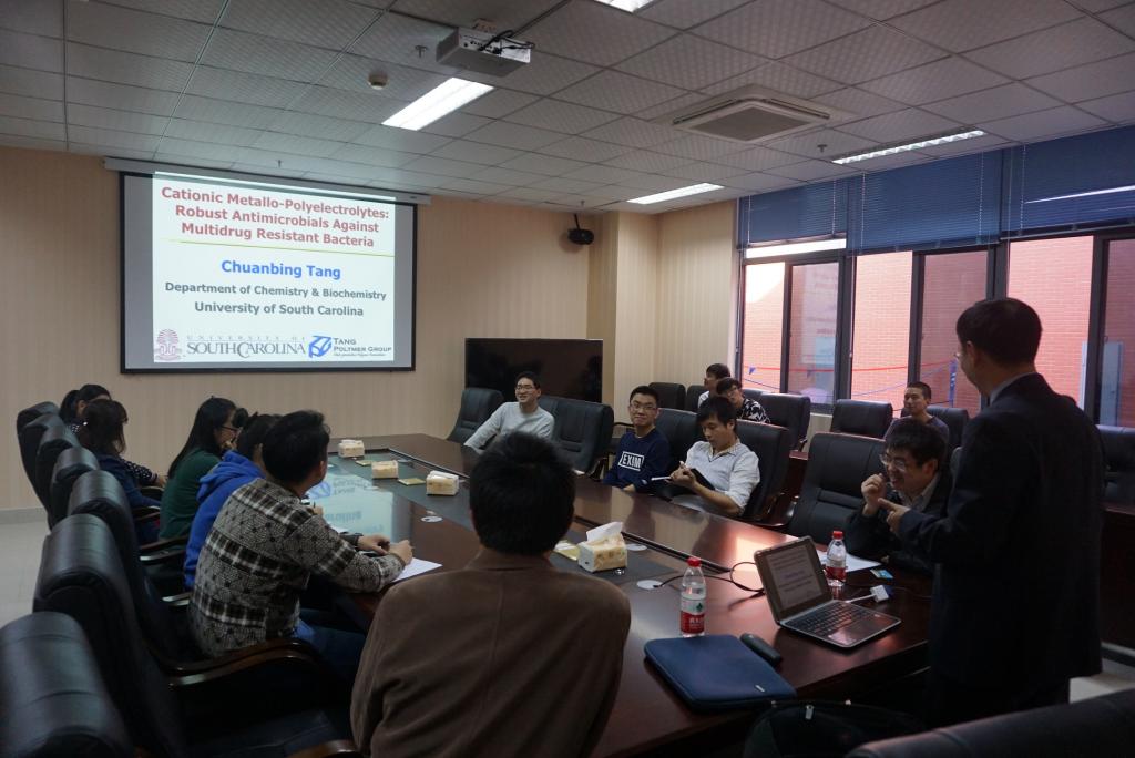 2017年1月3日上午,美国South Carolina大学化学和生物化学系唐传兵教授受邀来我中心做了题为《Cationic Metallo-Polelectrolytes: A New Class of Antimicrobial Agents Against Multidrug-Resistant Superbugs》的学术讲座。
