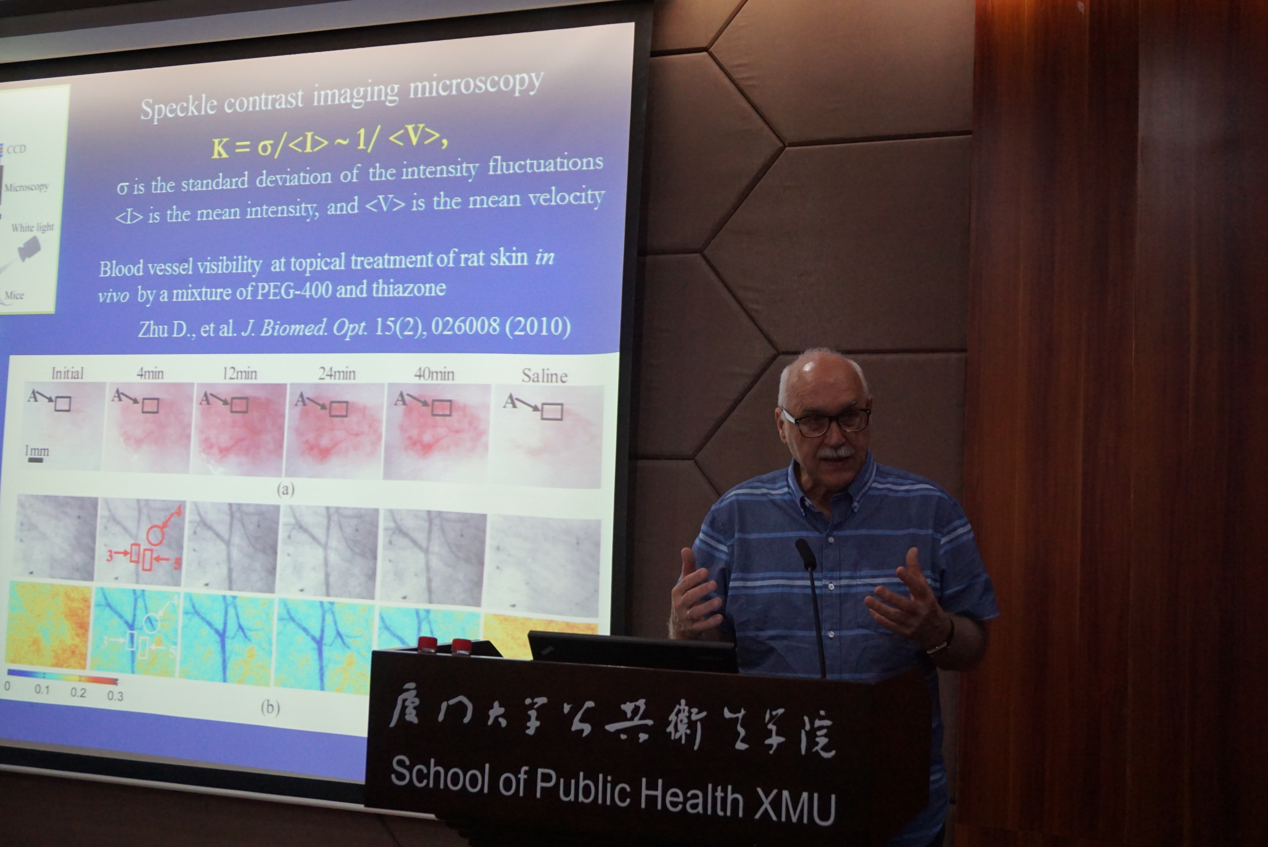2016年10月24日上午,我中心邀请俄联邦杰出科学家、俄罗斯科学院与工程院院士Valery Tuchin教授在公共卫生学院(曾宪梓楼)101报告厅作了题为《Tissue optics and optical clearing technologies》的南强生命科学系列学术讲座第49讲。本次讲座由聂立铭副教授主持,公共卫生学院赵勤俭副院长、杨机像书记、张宇斌主任作为厦门大学代表对Valery Tuchin教授的来访表示了热烈的欢迎。