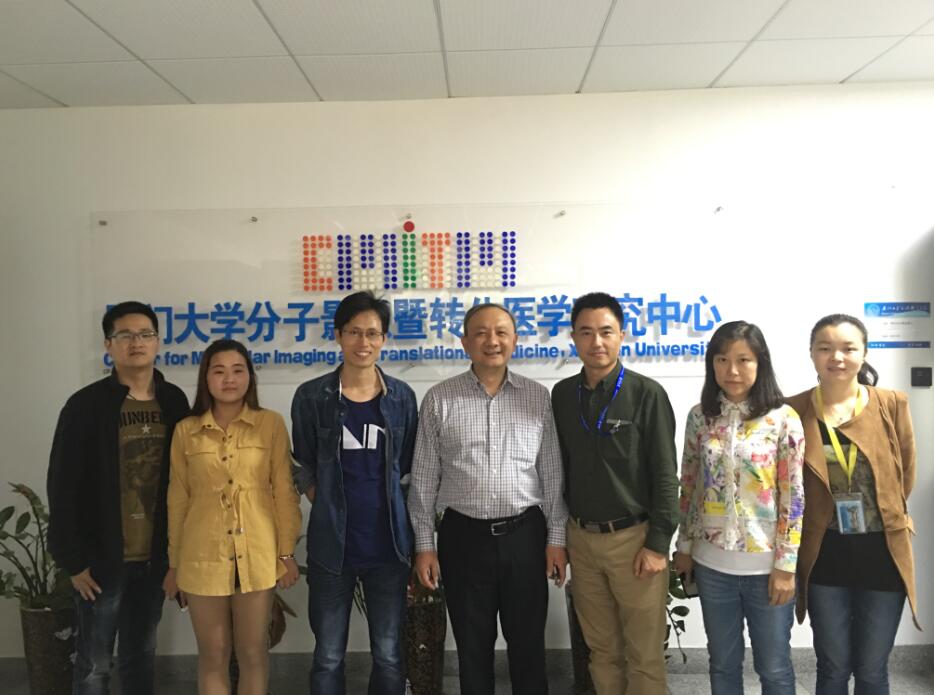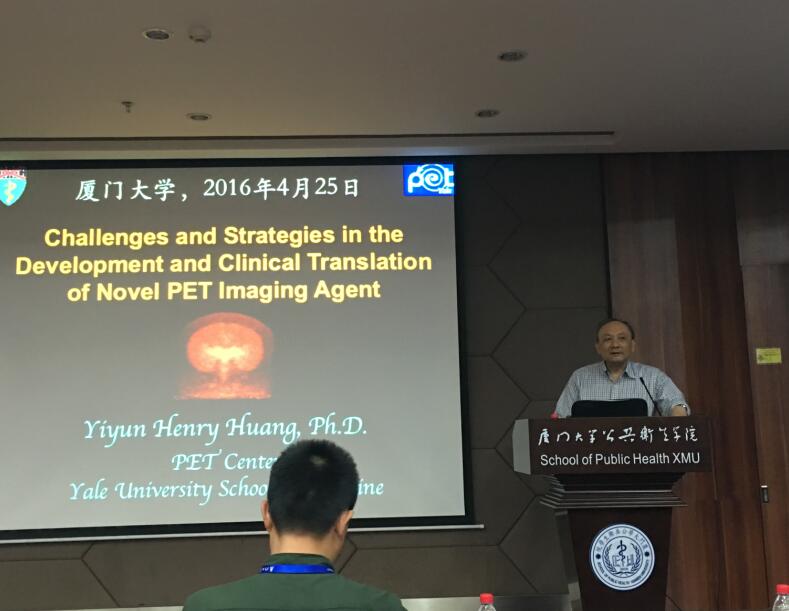 2016年4月25日下午和4月26日上午,分子影像中心有幸邀请到黄艺耘教授为全体师生进行了两场学术报告。黄艺耘教授现任美国耶鲁大学医学院放射诊断学系教授,耶鲁大学PET中心联合主任,厦门大学分子影像暨转化医学研究中心学术委员会委员。黄教授在2010、2011年先后被上海交通大学、北京师范大学聘为客座教授。黄教授长期以来一直从事临床前分子影像研究工作,主要研究方向:正电子药物(PET药物)的研发和应用。迄今已研发出用于诊断多种疾病的PET显像剂20余种,主持NIH等项目12项,已发表放射性成像领域专业论文100篇以上,并拥有一项美国专利及一项欧洲专利。作为PET成像领域的专家,黄教授先做了题为《Challenges and Strategies in the Development and Clinical Translation of PET Imaging Agents》的学术报告,为大家简单介绍了现如今PET造影剂的发展和前景,以及自己所在的科研团队在耶鲁大学取得的科研成果。