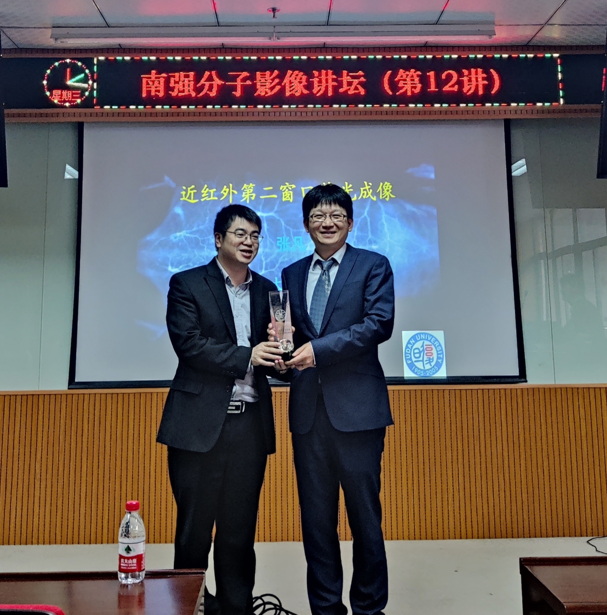 ▲ 刘刚教授(左)为张凡教授(右)颁发《南强分子影像讲坛》第12讲主讲人的荣誉奖杯