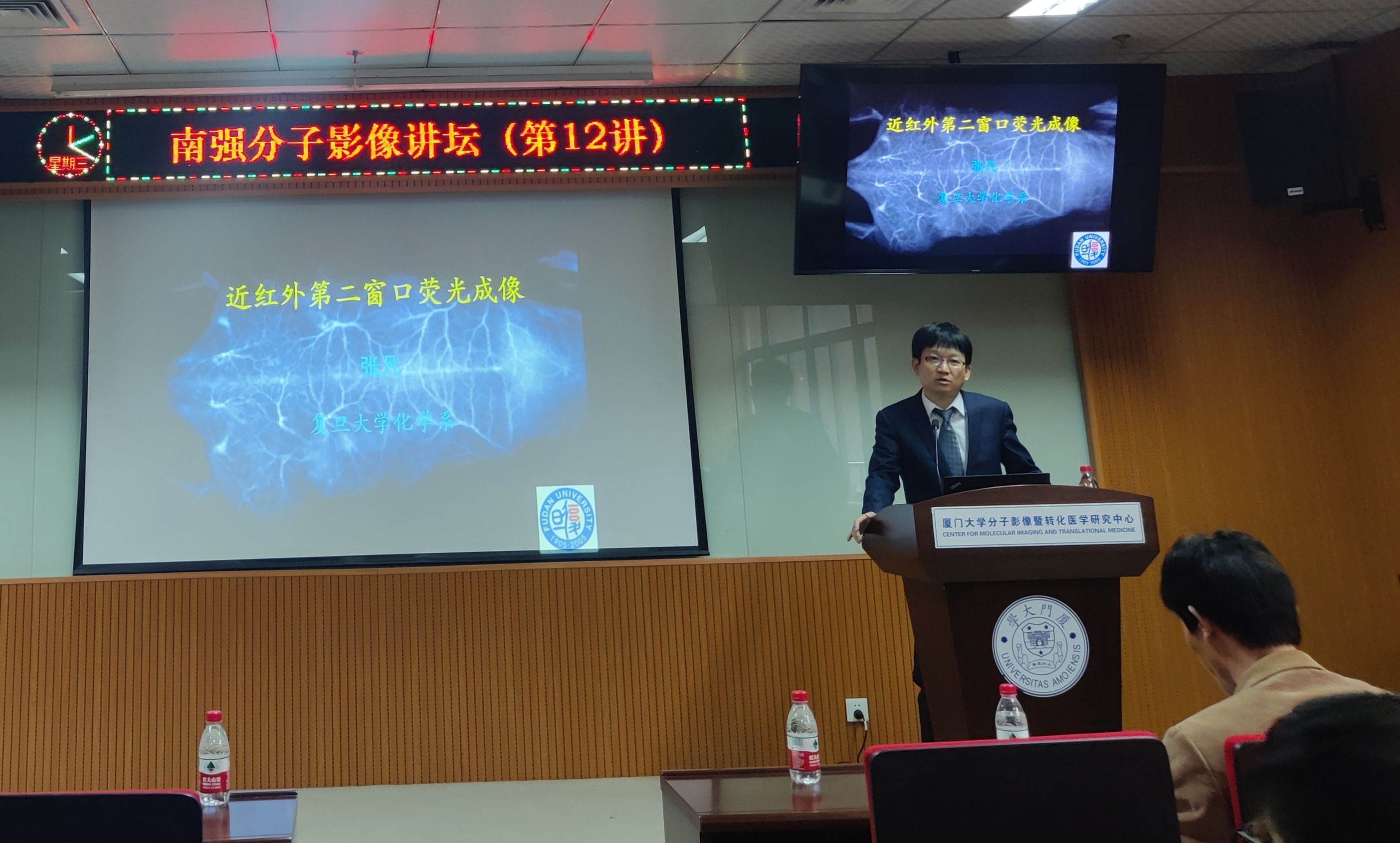 2021年12月17日,复旦大学化学系张凡教授受邀做客《南强分子影像讲坛》系列讲座第12讲,并作了题为《近红外第二窗口荧光多重成像分析》的主题讲座。讲座在分子影像楼410多功能报告厅举行,讲座由分子影像中心主任陈洪敏教授主持,厦门大学党委人才办公室副主任兼人事处副处长刘刚教授为主讲人张凡教授颁发《南强分子影像讲坛》荣誉奖杯。