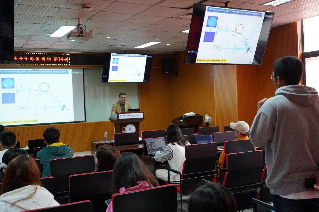 光学技术在现在生物医学中扮演着越来越重要的角色,然而由于生物组织光折射因子的天然空间不均匀性,光在生物组织中的传播受到很强的散射,导致了纯光学技术穿透深度和空间分辨率“鱼和熊掌无法两全”。如何实现散射光的聚焦并开展应用,是人们期盼但很有挑战性的目标。讲座中,赖博士带领大家回顾了过去十多年研究者们在光-声结合和光学波前整形技术等方面展开的诸多探索,以及在生物组织操控、成像及光学计算等领域的应用尝试,就光学技术在现在生物医学中的应用展开探讨,从基本原理到实际应用,由浅入深,由表及里,讲座内容丰富详实,深入浅出,会场气氛活跃,在场人员反应热烈,同学们就讲座主题与赖博士展开了激烈的探讨。