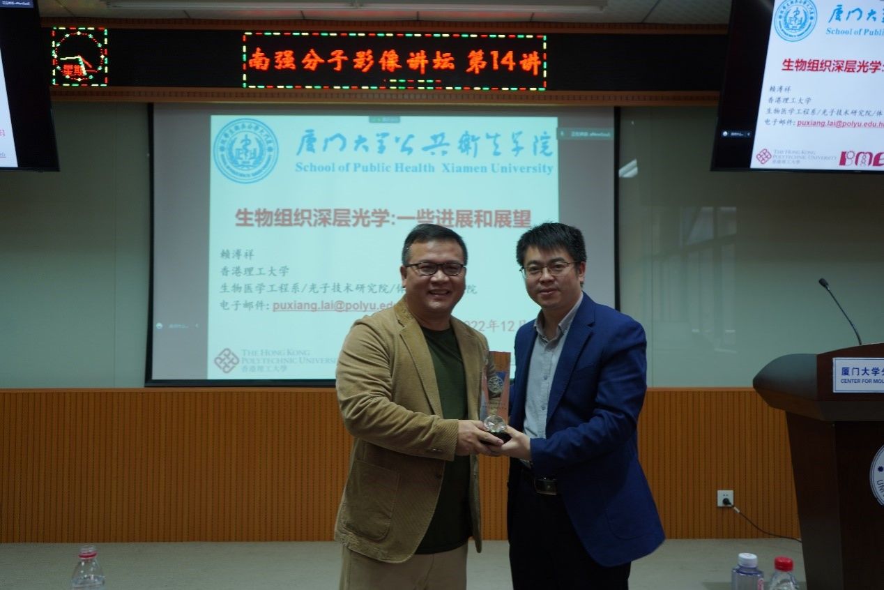 讲座开始前,公共卫生学院副院长刘刚教授代表中心为赖溥祥博士颁发了《南强分子影像讲坛》第14讲荣誉奖杯。