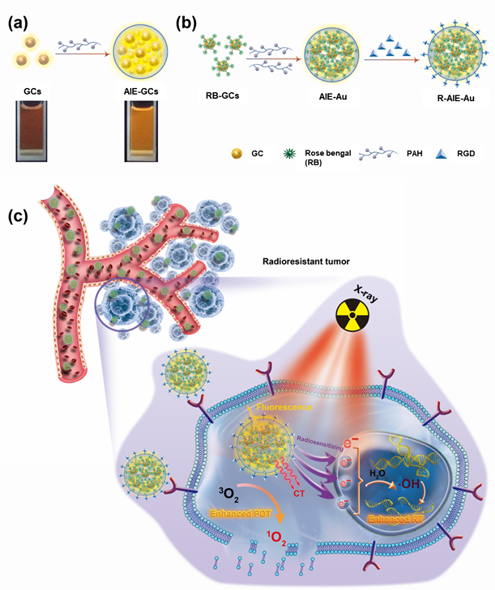 在前期研究工作基础之上,该课题组利用谷胱甘肽修饰金纳米簇(GCs)通过表面阳离子聚合物进行组装得到具有聚集诱导荧光增强效应(AIE)的金团簇聚集体(AIE-Au)。其X射线激发发光增强了5.2倍,能够有效激发光敏剂实现光动力治疗效果。金对X射线有很强的吸收能力,能够作为一种放疗增敏剂,产生羟基自由基增强放疗效果。体内外实验表明,AIE-Au能有效地通过触发活性氧的生成使得肿瘤治疗所需X射线的辐照剂量大大降低,通过独特的X-PDT机制实现了多种耐辐照肿瘤的治疗。这一工作所开发的X-PDT纳米敏化剂AIE-Au具备非常广阔的临床应用前景,该研究为设计开发X射线诱导减毒增效肿瘤诊疗平台提供了新的思路和方法。