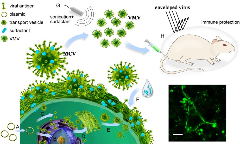 该成果通过在细胞膜表面进行蛋白抗原的结构改造和表面活化剂的嵌入,创制了一种新型的尺寸可控并能展示多种病毒包膜多肽和蛋白的纳米囊泡。该纳米载体在后续实验中证明不仅在尺寸、形态以及重要的免疫原性上成功模拟了天然的流感病毒,而且可以有效的在小鼠体内诱导抗病毒的中和抗体,表明了拟态病毒纳米囊泡作为普适性的抗原投递系统在快速应对包膜病毒疾病方面的巨大潜力。