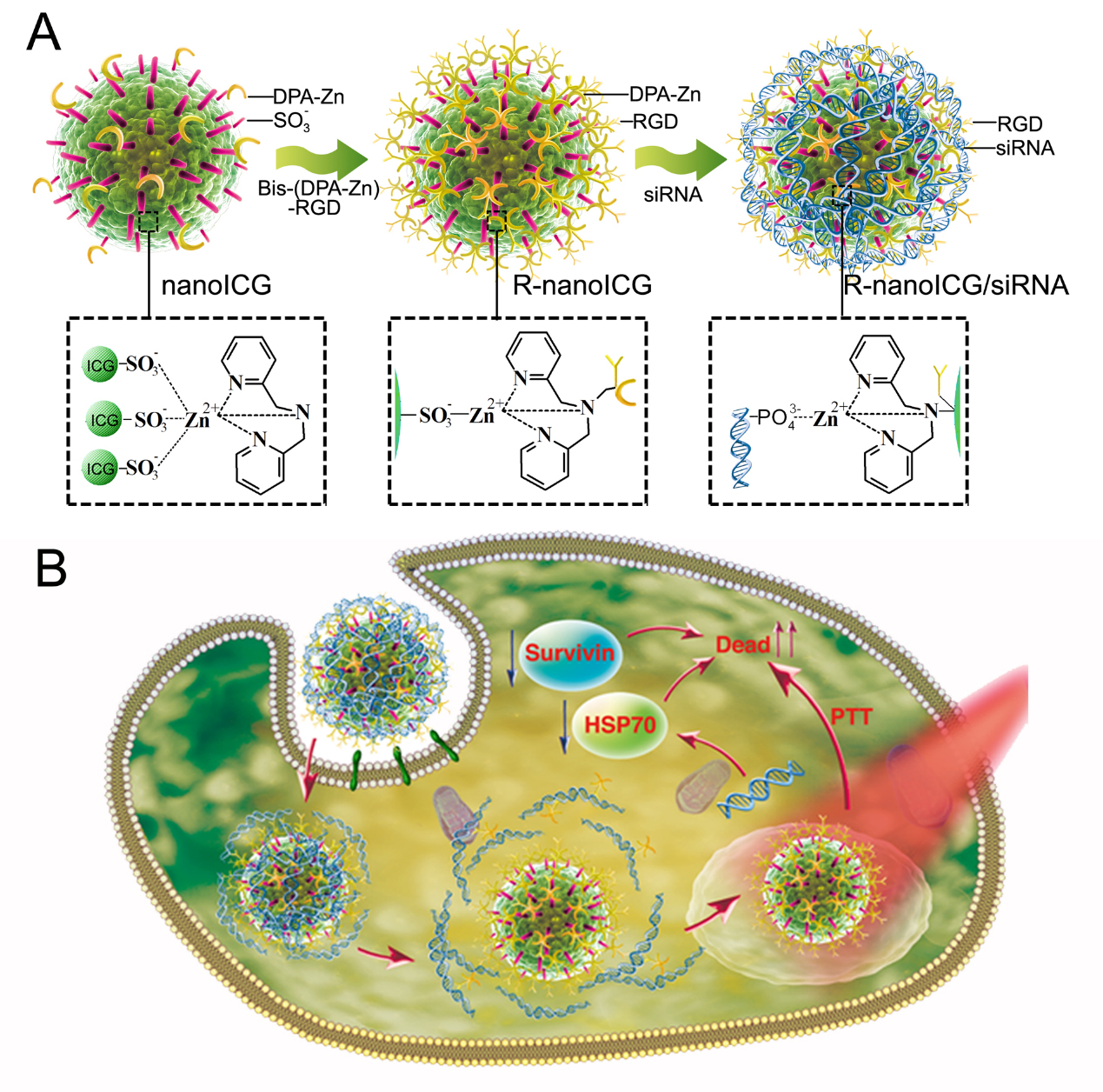 在本研究中,楚成超等发现Zn(II)-二甲基吡啶胺(DPA-Zn)具有比Zn2+更强的磺酸根结合能力,并且依靠独特的分子空间结构与ICG分子结合能够形成结构稳定、形貌均一的ICG纳米结构(nanoICG)。基于DPA-Zn的引入,nanoICG具有优于小分子ICG的光热、荧光和光声性能。进一步在nanoICG表面修饰RGD多肽(R-nanoICG)之后可以增加survivin-siRNA(S-siRNA)在体内的递送并实现肿瘤的基因和光热协同治疗效果。这种新型的金属有机纳米结构作为药物递送载体具有以下的优势:(1)制备方法简单,具有较好的生物活性;(2)多种不同功能的集成进行靶向性治疗;(3)修饰方法简单并能够根据联合治疗的目的设计多种功能基团;(4)较好的生物相容性和临床转换性,拓展纳米制剂的制备策略和联合治疗方案。