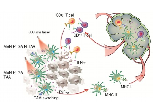 肿瘤免疫治疗,由于其在特异性攻击肿瘤细胞的同时不会伤及机体的正常细胞,从而可以有效的避免放疗及化疗给机体带来的毒副反应,近年来备受关注,成为肿瘤治疗领域的焦点。然而,临床发现针对肿瘤的单纯免疫疗法其治疗效果往往表现乏力,因此对肿瘤的治疗常常利用协同治疗策略来缓和肿瘤微环境中的免疫抑制性。在肿瘤微环境中,肿瘤相关巨噬细胞(Tumor associated macrophages,TAMs) 是其免疫抑制的关键驱动因子, 其不仅可以抑制 T 细胞活化, 还能促进肿瘤转移以及引发肿瘤细胞对治疗的耐受。而M1型巨噬细胞,其可分泌多种因子(如, IFN-γ、 TNF、 IL-6等)解除免疫抑制,其强的抗原呈递能力可刺激机体产生效应T细胞抑制肿瘤细胞增殖或直接进行毒性杀伤。鉴于此,该成果利用TAMs在肿瘤微环境中的高渗透性及数量优势,设计并成功合成了生物可降解的甘露糖(MAN) -聚乳酸-羟基乙酸(PLGA)共聚物靶向纳米粒子并分别将光敏剂ICG及肿瘤相关抗原递送到肿瘤相关巨噬细胞的溶酶体和胞质,通过智能光控产生的ROS实现了将M2型肿瘤相关巨噬细胞转化为可杀伤肿瘤细胞的M1型巨噬细胞,同时增强其抗原呈递能力,刺激机体产生效应T细胞(effector T cells)并转化免疫抑制性调节性T细胞(Regulatory cells,Tregs ),改善了肿瘤免疫抑制的微环境,从而实现利用TAMs作为潜在治疗靶点的一种新型的肿瘤免疫治疗方法。