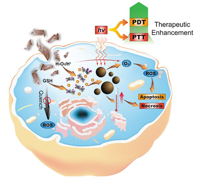 肿瘤光学疗法可以在特定肿瘤组织进行定位照射,可以重复给药,操作方便简单。但是,临床肿瘤光学治疗的疗效一直受着光漂白,较低的肿瘤选择性和肿瘤厌氧环境的限制。而利用自组装纳米技术制备光敏剂纳米药物制剂能够有效提高光动力效率和光敏剂的安全性。在本研究中,刘刚教授研究小组研究了临床抗肿瘤光敏剂华卟啉钠(DVDMS)的光学治疗方法。DVDMS是江西宜春青龙高科技股份有限公司自主研发的1.1类新药(目前处于临床阶段)。刘刚教授小组创新性地探索优化了临床抗肿瘤光敏剂华卟啉钠(DVDMS)和金属离子如锰离子(Mn2+)相互作用自组装形成纳米制剂的条件和方法。进一步设计采用MnO2纳米片作为DVDMS的递送载体并应用于体内肿瘤部位的O2和DVDMS纳米结构生成器。在MCF-7细胞和荷瘤鼠模型试验中,MnO2/DVDMS被谷胱甘肽(GSH)和双氧水(H2O2)的共同做用下被分解并二次组装成DVDMS纳米结构。在动物磁共振、光学、光声成像实时监控下,试验揭示了GSH的减小,O2的产生以及DVDMS纳米结构在肿瘤部位的再次形成是显著提高光学治疗抗肿瘤效果的主要机制。这种肿瘤微环境智能响应的光敏剂二次纳米自组装行为的理论设计及试验验证有望为未来临床肿瘤纳米医学及诊疗技术提供全新的方法和策略。