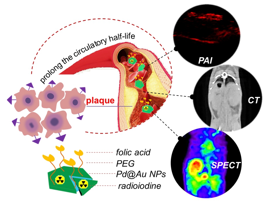 动脉粥样硬化高危斑块具有破裂倾向、易发生血栓等危险,是大多数急性心血管事件的罪魁祸首。近年来,利用非侵入、高敏感以及实时动态的在体分子影像学手段对动脉粥样硬化斑块进行特异性诊断成为研究热点。近日,厦门大学分子影像暨转化医学研究中心张现忠团队、化学化工学院郑南峰团队与中国医学科学院药物研究所朱海波团队合作在《Nano Research》(2020, 13: 173–182)上发表论文,报道一种以二维钯金纳米片为载体的叶酸受体靶向放射性分子探针用于动脉粥样硬化高危斑块的在体成像研究。