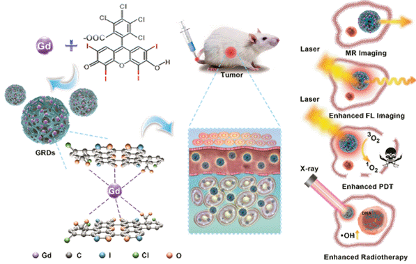 众所周知,光学疗法具有侵袭小、副作用小、耐药性小等优点,在临床上被快速发展用于治疗各种肿瘤。然而,激发光的固有浅穿透特性限制了PDT策略的广泛应用。近些年来,联合治疗方法在肿瘤治疗领域快速发展。课题组利用钆离子(Gd(III))和临床上应用的光敏剂药物孟加拉玫瑰红(Rose Bengal, RB)通过溶剂热反应成功合成了钆-RB配位聚合物纳米点(GRDs)。对比孟加拉玫瑰红前体小分子,GRDs具有独特的吸收特性和7.7倍的显著荧光增强,单线态氧(1O2)生成效率提高了1.9倍。对比常用的磁共振造影剂Gd-DTPA,GRDs的r1弛豫度增加了两倍,同时显示出较强的X射线吸收能力。体外和体内实验结果,证明了GRDs的这些优异性能以及优良的生物相容性和体内安全性。此外,对比单一疗法,GRDs结合了光动力疗法(PDT)和放射疗法(RT),能显着抑制肿瘤的生长,具有广阔的临床转化研究前景。相关研究成果发表在Advanced Materials (2020, 32, 2000377)。