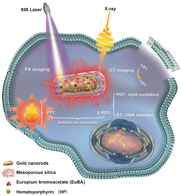 此外,课题组还将光热治疗(PTT)和X-PDT联合,以X射线为激发源的X-PDT与PTT结合能够弥补穿透力的不足;另一方面,PTT可用于抑制DNA损伤修复,增强纳米颗粒在肿瘤中的通透性,增加氧灌注,有利于提高PDT或RT等依赖氧的治疗手段的疗效。我们制备的这种偶联闪烁体和光敏剂的多功能金纳米棒,可以实现CT/PA成像引导下的PTT和X-PDT。通过PTT和X-PDT的联合治疗,一定程度上避免了PTT复发的风险,低剂量的激光和X射线也减少了副作用的危害。镧系配合物闪烁体与金基纳米材料的结合在深部肿瘤的多模态诊疗一体化中具有巨大的潜力。相关研究成果发表在ACS Applied Materials & Interfaces (2020, 12, 12591)。