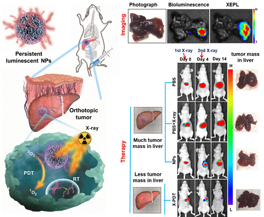 另外一种策略是使用包含闪烁体材料和光敏剂的纳米敏化剂,在相同电离辐射下同时激活PDT和放射疗法(RT),即X射线诱导的光动力疗法(X-PDT)。其中长余辉材料作为一种特殊的闪烁体材料已经引起了生物医学研究者的更多关注。余辉发光不同于普通的荧光材料需要外源光的持续照射产生荧光,而是在终止外源光激发后仍然能够持续发光一段时间,这就避免了生物自发光的存在,可以明显提高信噪比,增强成像的灵敏性和特异性。基于此,课题组采用介孔二氧化硅模板法制备了具有均匀尺寸和单分散球形形貌的mZGGOs长余辉纳米粒子。在低剂量X射线照射下,mZGGOs可发出明显的近红外长余辉光,并且能够穿透1cm肌肉组织在小鼠体内实现有效的余辉成像。通过装载光敏剂,X射线激发的余辉光能够有效激发光敏剂从而杀死癌细胞。体内原位肝癌的余辉成像显示,纳米粒子通过被动靶向机制积聚在肝癌组织中,X-PDT可有效抑制原位肝肿瘤的生长。相关研究成果发表在Advanced Functional Materials (2020, 30, 2001166)。