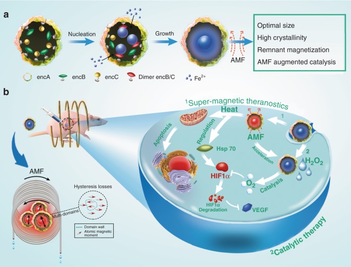 本研究中,课题组重组了黄色粘球菌中的储铁蛋白,并利用绿色简单快速的仿生矿化技术制备出磁场特定吸收速率(SAR)高达2390 W/g的磁性蛋白纳米笼(eMIONs),比临床用的菲立磁(Feridex,115 W/g)提高了20倍。因此eMIONs的磁-热转化效率极高,5分钟内即可达到有效热疗温度(15kA/m,300kHz)。经探究发现,其具有优异磁响应性能的机理是eMIONs拥有适宜的粒径尺寸,结晶度几乎达到100%,而且在磁场中具有剩磁效应。更有趣的是,我们发现eMIONs还是一种高效的类过氧化氢酶,并且在磁场作用下,其催化效率大幅提升,从而有效的改善肿瘤微环境,实现磁热与催化作用的协同治疗。实验结果显示,eMIONs不仅能有效抑制小鼠皮下瘤模型的生长,还能将小鼠原位肝癌模型的生存时间延长一倍。因此,这种简单的仿生治疗策略成功克服了磁热疗法的瓶颈,也为生物纳米医疗开辟了的新方向。