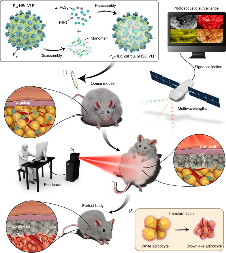 光动力疗法(PDT)和脂肪棕化诱导是两种独特的减肥方法。前者起效迅速但范围小,后者作用相对缓慢但影响广泛。尽管它们存在互补性,但少有研究将二者结合,故研究者就设想了脂肪光动力/棕化治疗方案。进一步,考虑到该方案需要有一个精准、无损的反馈模式来确定PDT最佳时间窗(即光敏剂在脂肪组织达到最大浓度时间)和评估整个方案的疗效。研究者便聚焦于融合多种成像优势的光声成像技术,一方面它可以利用光敏剂的光吸收特性来示踪其在体内的生物分布,另一方面它具备可视化监测脂肪可能发生的效应变化的能力。就这样,光声分子成像护航下的光动力/棕化抗肥胖策略被提出了。为实现该策略,研究者通过基因工程技术改造了乙肝病毒核心蛋白(HBc)颗粒,使其带有白色脂肪靶向,随后载上药物罗格列酮和锌酞菁,从而制得靶向性病毒样复合物。最终,利用该复合物,研究者成功实现光声分子成像护航下的脂肪光动力/棕化抗肥胖策略,并充分论证该策略的有效性、可靠性及安全性。