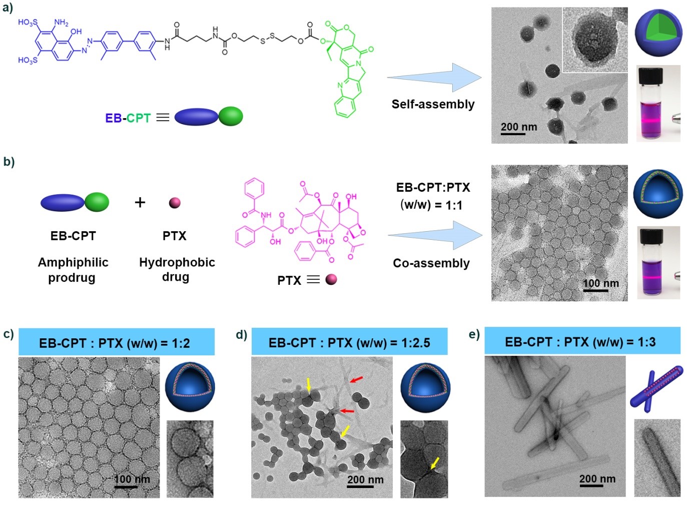 紫杉醇(Paclitaxel,PTX)被广泛用于卵巢癌、乳腺癌、肺癌、头颈部肿瘤等癌症的治疗。2005年,白蛋白结合型紫杉醇(Abraxane®)被批准上市,较好地解决了传统方法采用蓖麻油及无水乙醇来改善紫杉醇(PTX)水溶性带来的严重过敏反应以及外周神经毒性。然而,Abraxane药物中PTX的载药浓度较低,在多种肿瘤治疗方案中仍然需要联合其他药物来实现有效的肿瘤抑制效果。因此,基于紫杉醇(PTX)的高效、安全抗肿瘤应用吸引了广泛的关注,人们也纷纷将目光转向纳米药物策略。在本研究中,周子健研究团队采用一种喜树碱前药利用了一种喜树碱(Camptothecin,CPT)前药(EB-CPT)与紫杉醇(PTX)的共组装策略,得到了一类尺寸均一、质量比可调、形貌可变的囊泡状纳米药物(ECX)。