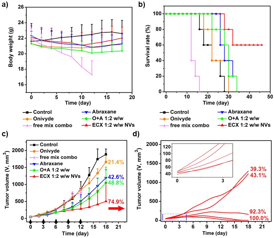 在抗肿瘤实验中,ECX囊泡纳米药物中CPT和PTX两种化疗药物对结直肠癌HCT116细胞和小动物肿瘤模型中表现出良好的协同效应(协同因子CI在0.50~0.79之间),实现了“1+1>2”的效果。与两种药物的简单混合组合、以及已被美国FDA批准的基于CPT和PTX的抗癌纳米药物(Onivyde和Abraxane) 及其组合相比,本文所报道的ECX共组装囊泡纳米药物表现出显著提升的抗肿瘤效果,为抗癌药物开发和转化医学提供了新的思路。