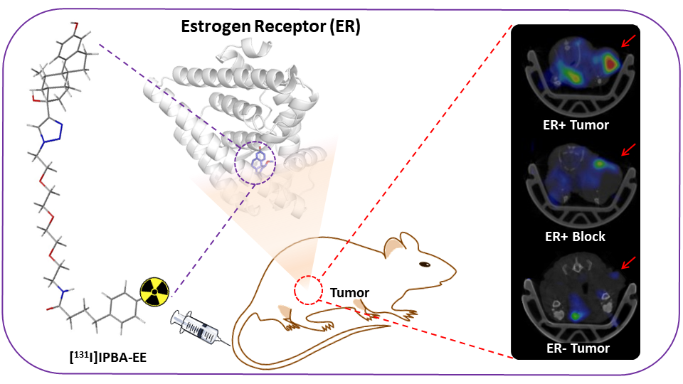 乳腺癌的发病率和死亡率在全球女性恶性肿瘤中居于首位,超过70%的乳腺癌过度表达雌激素受体(ER),开发活体内ER的定性和定量的探针对乳腺癌分子分型、精准治疗和预后评估等具有重要意义。近日,张现忠教授团队在分析化学顶级刊物Analytical Chemistry上在线发表了题为"Radioiodinated 4-(p-iodophenyl) butanoic acid modified estradiol derivative for ER targeting SPECT imaging"的研究论文,报道了一种131I标记雌激素衍生物的探针用于ER阳性乳腺癌的SPECT显像。