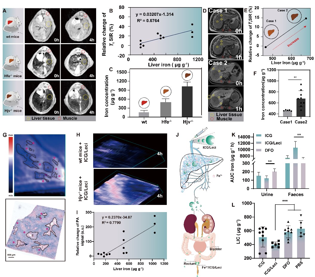 两亲性ICG是被FDA批准用于临床的诊断制剂,已被作为动态评估肝功能和病人心输出量的检测标准。基于本团队前期金属离子配位自组装药物研究工作基础(Nat Commun. 2020; Angew Chem. 2019; JACS. 2018; Adv Mater. 2017; Sci Adv. 2016),本研究原创性地提出开发ICG 作为铁螯合剂,用于体内外铁过载疾病的诊疗一体化研究。团队结合理论计算及实验验证了ICG 螯合Fe3+具有高特异性和灵敏性,而当ICG 螯合 Fe3+ 后将有效屏蔽Fe3+原有的T1信号,其机理为:通过ICG 疏水基团限制 Fe 离子周围水交换,从而产生较短的自旋晶格弛豫时间及较低的 r1 值,进而引起 MR 图像具有 T1 信号强度比变化(T1SRC),此变化值与ICP测得的啮齿动物模型和人体肝脏活检组织中的肝脏铁含量(LIC)高度正相关。同时与现有临床中常用去铁制剂——去铁胺(DFO)相比,ICG 不仅可以提供 Fe3+定位及定量信息,还可使肝脏中铁的去除效率提高100%并且具有良好生物安全性。本研究提出的原创技术一次性实现了铁超负荷疾病的无创检测和高效治疗,是一种简单且可临床广泛推广的铁过载疾病诊疗一体化策略,目前该方法已经获得中国发明专利授权(ZL202010387159.9)并已通过多家三甲教学型医院的医学伦理委员会审核开展临床应用推广研究(ChiCTR2000035648)。