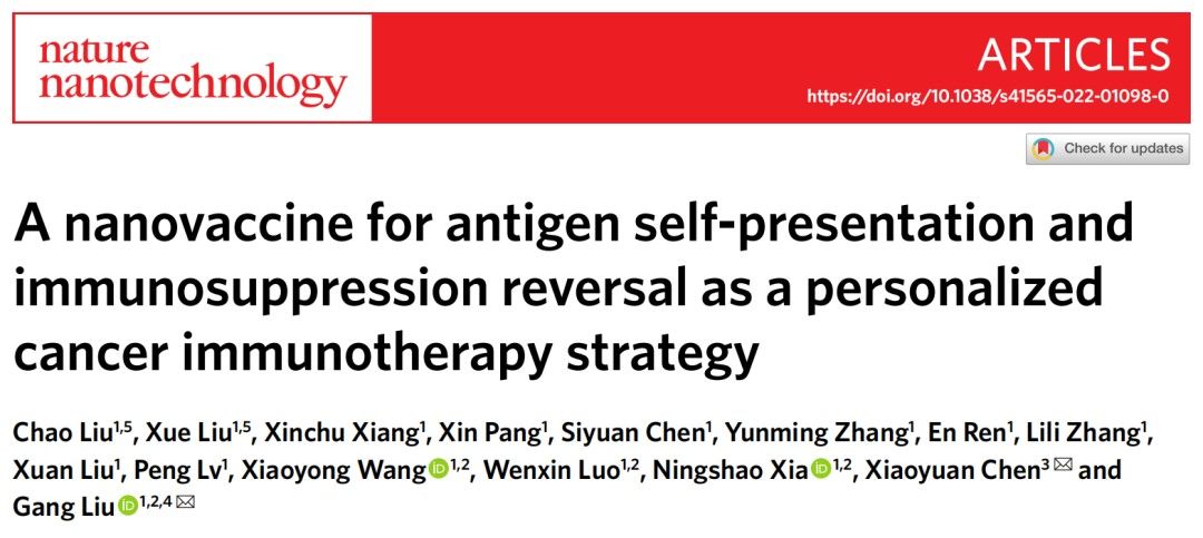 近日,我中心刘超博士在国际顶级学术期刊Nature Nanotechnology(IF=39.213)上发表了题为“A nanovaccine for antigen self-presentation and immunosuppression reversal as a personalized cancer immunotherapy strategy”的研究论文。该研究发现了共刺激信号对肿瘤免疫耐受中T细胞功能重塑的重要机制,并首次报道了一种既可直接激活初始T细胞,又可活化耗竭性T细胞的肿瘤疫苗策略,为个性化肿瘤疫苗研发提供了理论依据和创新方法。同时,Nature Nanotechnology配发专题亮点评述文章“Boosting dendritic cell nanovaccines”,评价这项工作突破了现有树突状细胞疫苗的认知框架,推动纳米疫苗免疫学领域向前迈出一大步。