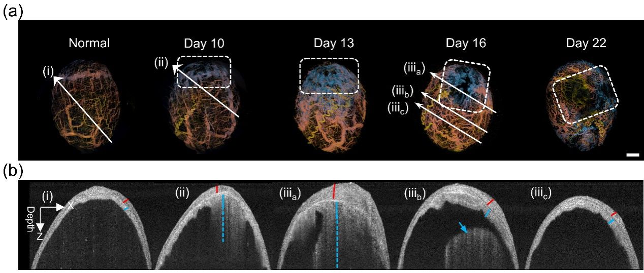 mm)的活体下的动态监测以及血液动力学参数量化。此外,利用OCTA技术探测了不同生长周期下膀胱肿瘤表面微血管特征信息,结果表明随着肿瘤生长与增大,其微血管沿着肿瘤中心逐渐向周边减少并取而代之出现更多深层血管规律。最后,实现了肿瘤侵犯膀胱壁各层组织生长过程中的高分辨率结构图像,为临床膀胱癌早期诊断提供参考。
