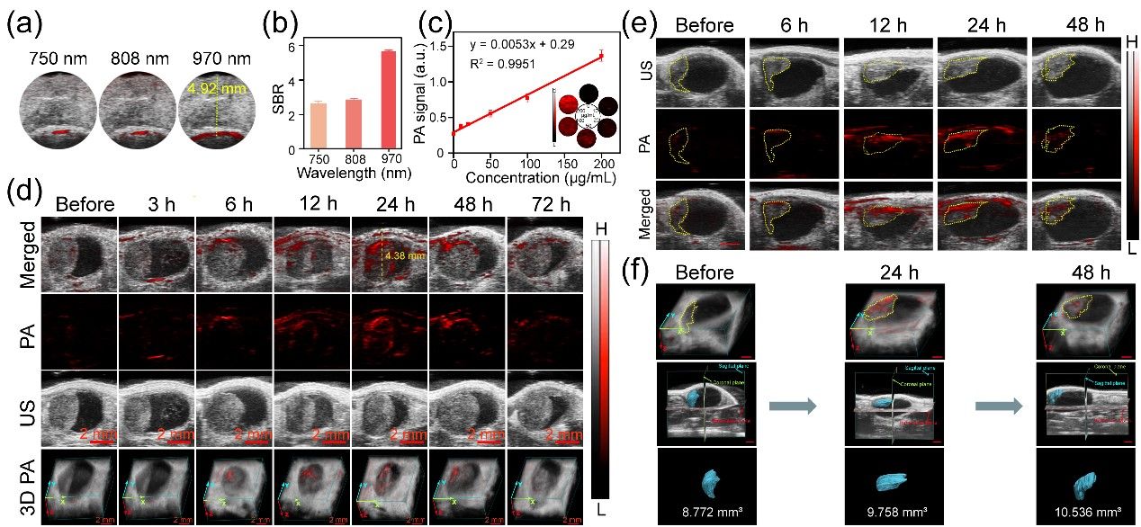 基于研究团队前期自主搭建的光声成像(Photoacoustics. 2020, 17, 100152)与光学相干成像系统与肿瘤分子影像研究基础上 (Adv. Sci., 2021, 202101242,封面文章)。本研究我们首先通过超声引导下经尿道建立原位BC模型,提出一种双模态三维 (3D) NIR-II(波长1000-1700nm)光声(PA)和光学相干断层血管成像(OCTA)分子成像协同策略;并开发了一种NIR-II (HAPO-1048)光热制剂,用于原位膀胱癌靶向光热治疗,结果表明其具有较强的NIR-II光吸收特性、生物相容性以及高效PTT治疗效果。利用NIR-II PAI成像技术,实时动态跟踪了该制剂24 h出现明显富集(PA值为0.913 ± 0.058),与NIR-I PAI(750 nm 和808 nm)相比,NIR-II PAI具有更深的穿透深度和更高的信噪比(5.66 ± 0.097)。同时在光声成像下,实现了高灵敏度和特异性BC(直径约2