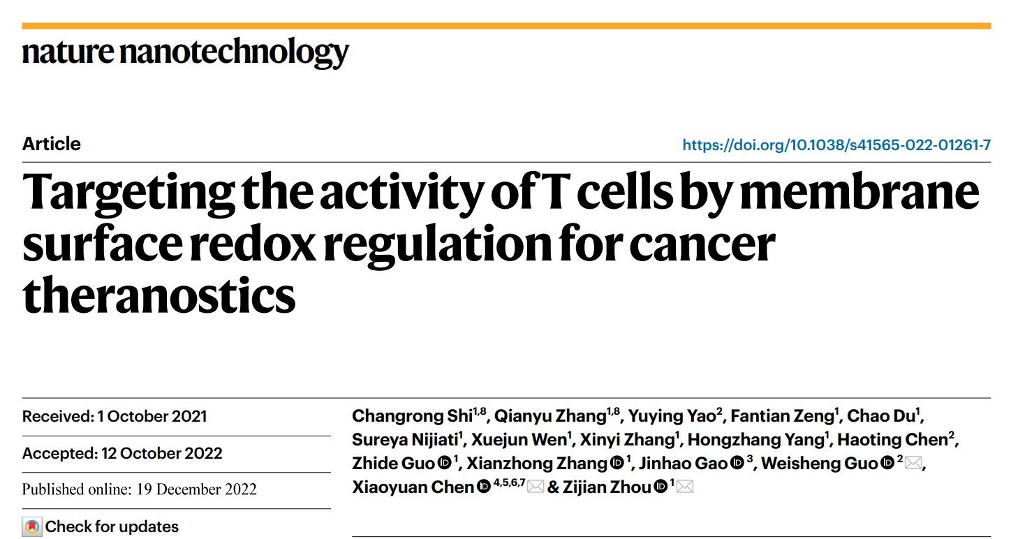 近日,我中心周子健老师课题组与新加坡国立大学陈小元教授、广州医科大学郭伟圣教授合作在国际顶级学术期刊Nature Nanotechnology上发表了题为“Targeting the activity of T cells by membrane surface redox regulation for cancer theranostics”的研究论文。该研究针对T细胞在活性氧微环境中发生免疫活性耗竭的关键科学问题,首次利用化学生物学手段靶向捕获T细胞膜表面活性氧,实现了T细胞免疫活性的在体可视化调控。