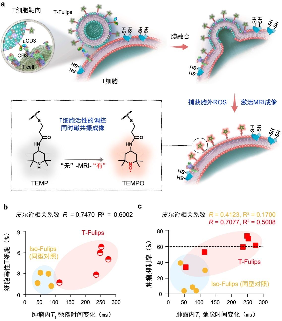 针对活性氧环境中T细胞衰竭而失去免疫活性的关键科学问题,我们构建了一种T细胞靶向的膜融合脂质体,T-Fulips(图1)。它与T细胞靶向膜融合后,将一种经典的活性氧捕获剂2,2,6,6-四甲基哌啶(TEMP)分子展示到T细胞的表面,捕获T细胞膜表面的活性氧,从而提升T细胞在活性氧环境中的免疫活性。同时,TEMP分子本身由逆磁性被氧化为顺磁性的TEMPO,激活磁共振成像,实现了T细胞免疫活性的可视化调控。