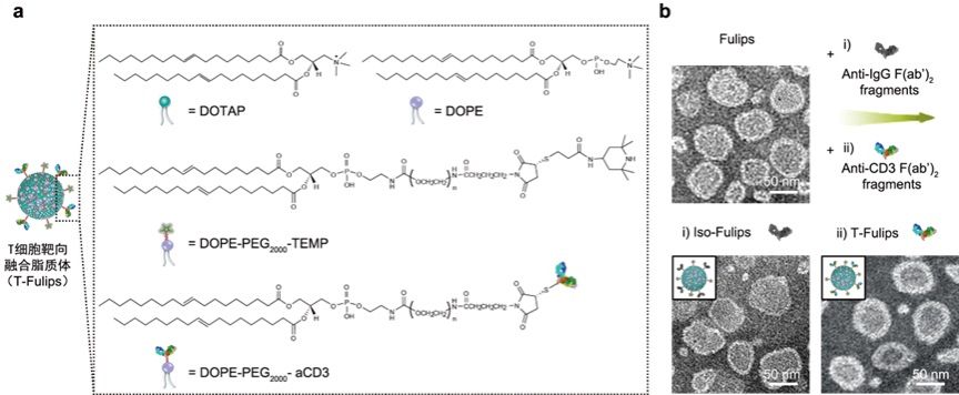 图1:(a)T-Fulips组分及结构示意图;(b)T-Fulips及同型对照Iso-Fulips透射电镜