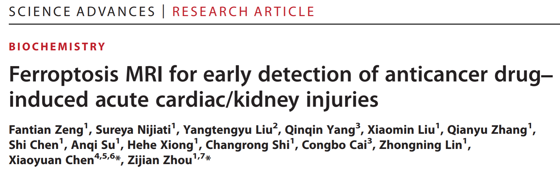 近日,我中心周子健老师课题组联合新加坡国立大学陈小元教授在Science Advances在线发表了题为“Ferroptosis MRI for early detection of anticancer drug-induced acute cardiac/kidney injuries”的研究成果。该研究利用青蒿素与活性铁(Fe2+)离子特异性反应后的大分子效应和滞留效应,设计并构建了自增强型活性铁池靶向MRI探针Art-Gd,实现了化疗药物导致的急性心肌/肾损伤的早期诊断和铁死亡抑制剂治疗的疗效监测。