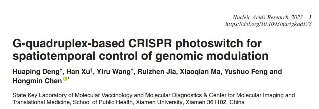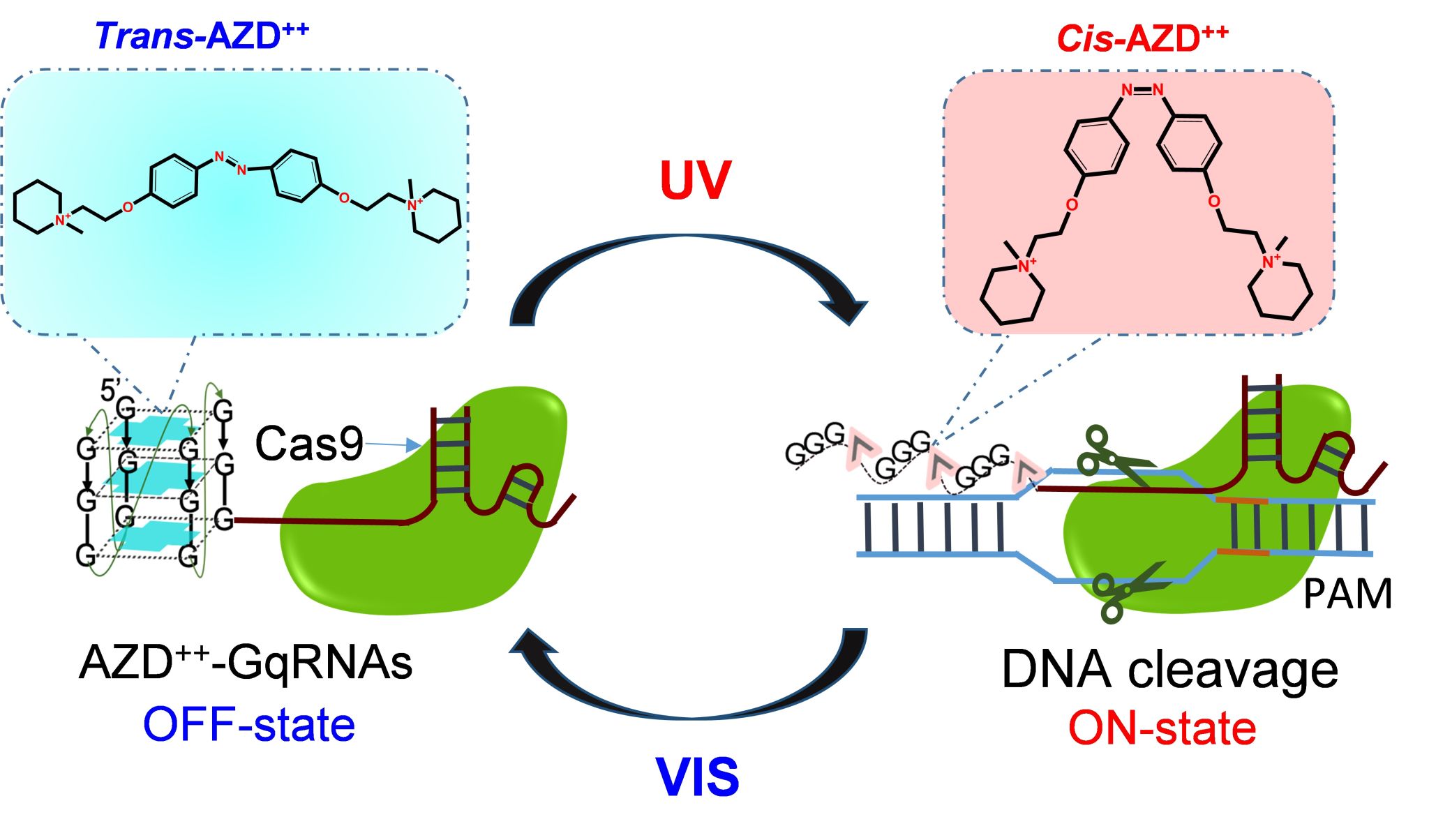 近日,我中心陈洪敏研究团队在Nucleic Acids Research期刊在线发表了题为“G-quadruplex-based CRISPR photoswitch for spatiotemporal control of genomic modulation”的研究性论文。该工作利用偶氮苯衍生物AZD++的光响应异构化特性及基于G-四链体的gRNA结构设计,实现了时空精确控制CRISPR介导的基因编辑与基因表达,显著降低了胞内脱靶效应的发生。
