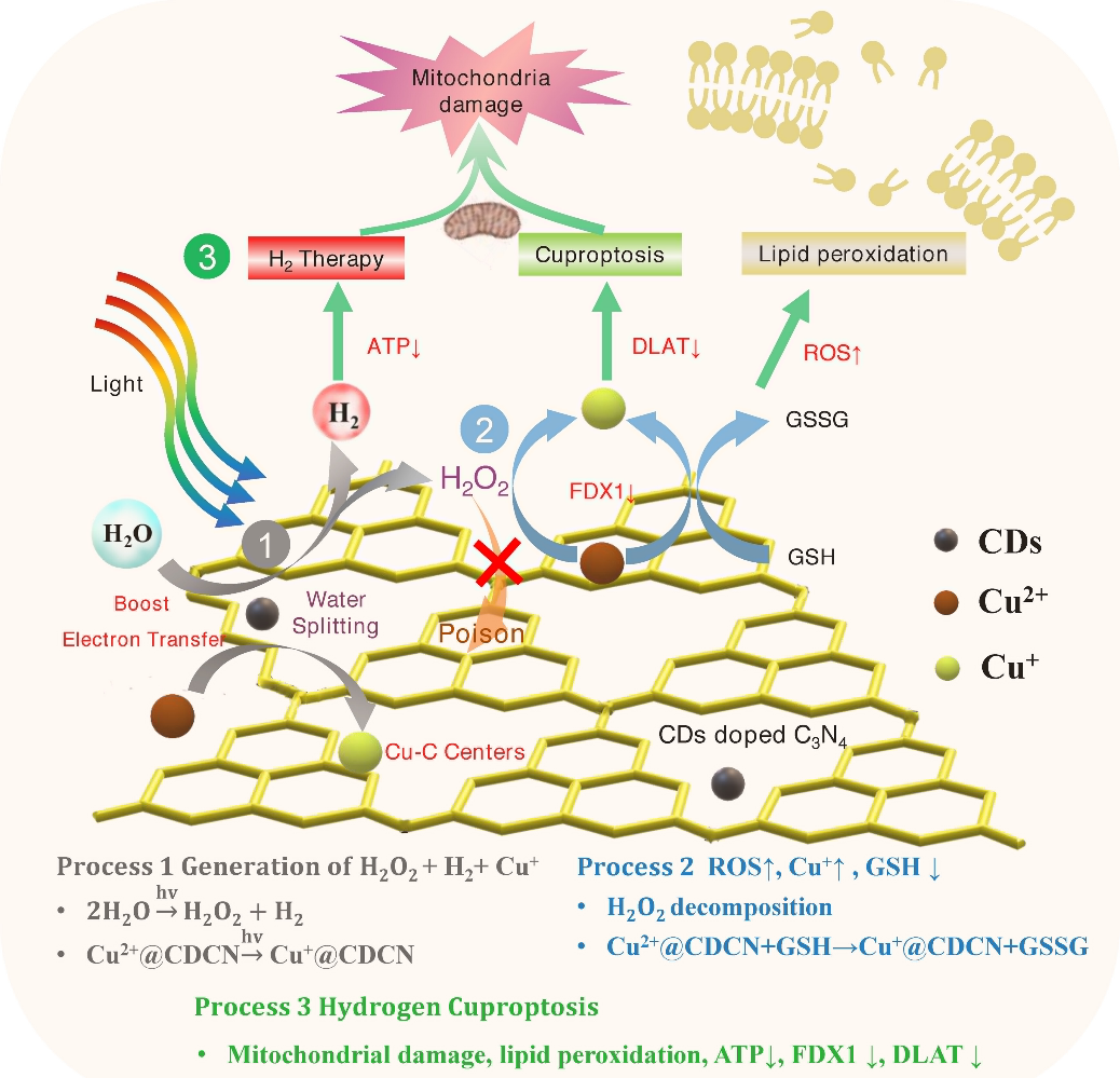 该工作中,在碳基的纳米光催化剂表面锚定上铜离子,(1) Cu2+的引入提高了光催化剂双电子过程产生H2和过氧化氢(H2O2)的效率,在靶标部位持续产生H2同时形成了铜-碳的氧化还原活性中心。(2)作为副产物,H2O2会沉积在催化剂表面是光催化持续进行的障碍;Cu2+与H2O2反应,消耗H2O2的同时加速了水分裂和Cu+的生成。(3) Cu2+通过金属还原作用与谷胱甘肽(GSH)作用,进一步破坏了胞内的氧化还原平衡。H2治疗和铜相关死亡的协同效应都诱导线粒体功能障碍和细胞内氧化还原稳态破坏。研究首次尝试在纳米医学中利用金属增强的碳基光催化剂水裂解技术将氢气疗法和铜死亡结合起来,从而提供一种安全有效的癌症治疗新策略。