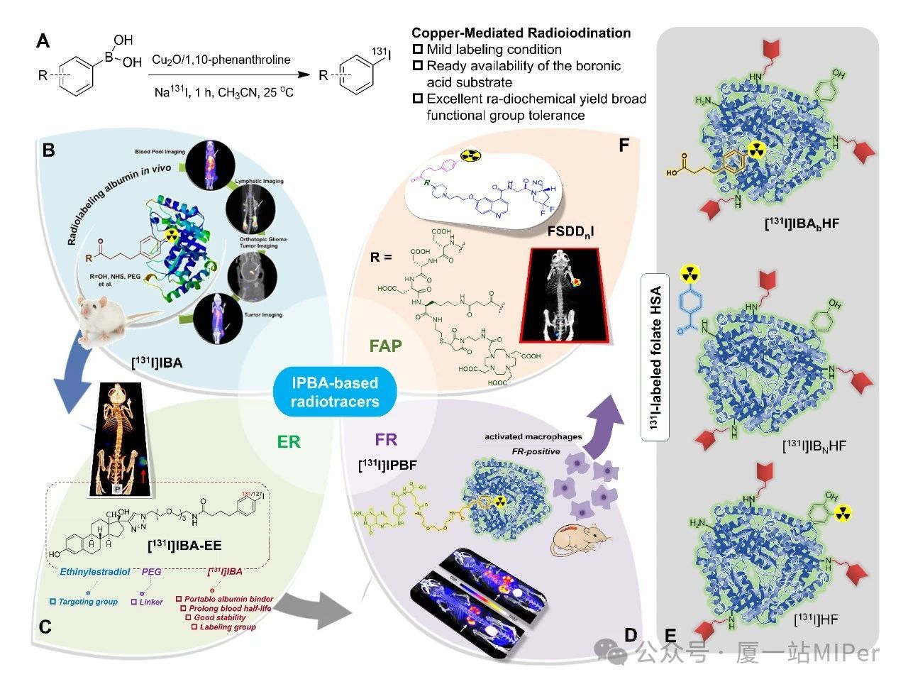 综述同时系统介绍了团队在IPBA修饰的放射性探针递送领域的研究成果(如铜催化的放射性碘标记策略,涵盖FAP、叶酸受体和雌激素受体等靶点探针),为诊疗型放射性配体的理性设计提供了参考。