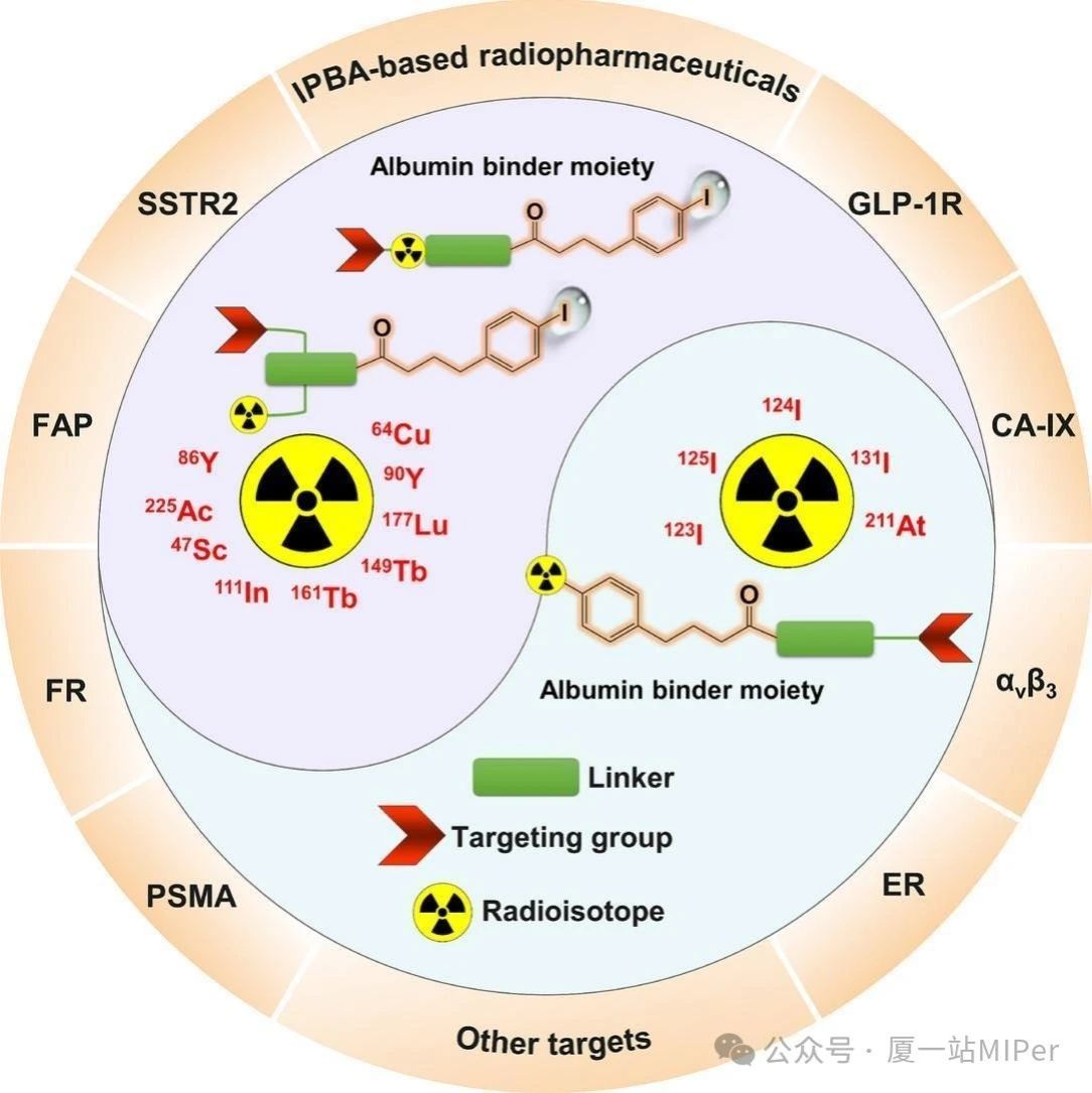 在题为“Development of Radioligands with an Albumin-Binding Moiety of 4-(P-Iodophenyl) Butyric Acid for Theranostic Applications” 的综述文章中,其系统总结了IPBA修饰的小分子放射性配体的最新进展。IPBA通过结合血清白蛋白显著延长药物血液循环时间,同时支持承载多种放射性核素(如放射性碘家族、砹-211等),实现诊疗一体化。此外,IPBA衍生物可通过调节苯环对位取代基(如Br、Cl、CH₃等)和连接臂长度,调控药物动力学特性,平衡肿瘤靶向与背景清除效率。目前,IPBA技术已成功应用于叶酸受体(FR)、前列腺特异性膜抗原(PSMA)、成纤维细胞激活蛋白(FAP)等多种靶点的放射性配体开发,显著提升肿瘤摄取与滞留效果。