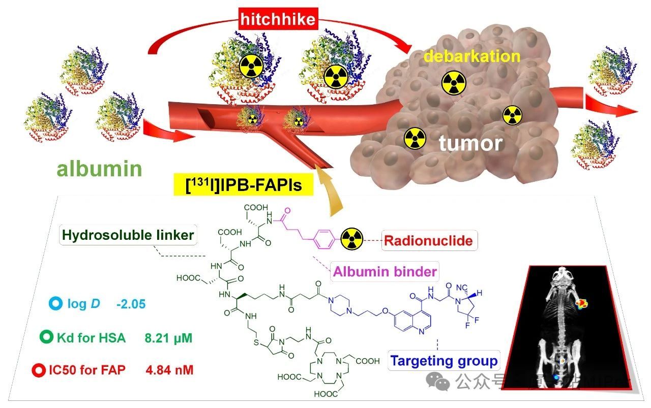 此外,在本月初,J Control Release期刊登了团队关于放射性碘标记FAP靶向探针的相关研究成果,为IPBA修饰探针工具箱再添新成员。成纤维激活蛋白(FAP)作为癌症相关成纤维细胞(CAFs)中具有代表性的生物标志物,在以组织重塑为特征的疾病损伤或者癌症中过表达,是非常有前景的诊疗靶点。而目前,血液清除快,肿瘤滞留相对不足等缺点阻碍了FAP靶向放射性探针在核医学领域的应用。因此如何改善放射性标记探针的药动学性质,提高肿瘤摄取,减少非靶器官滞留,成为该领域亟待解决的问题。放射性碘标记的IPBA-NHS可作为Bolton-Hunter试剂,无需额外螯合剂即可灵活构建FAP靶向放射性分子探针。IPBA这种兼具标记基团和白蛋白结合的功能,极大简化了FAP靶向放射性示踪剂的设计,为白蛋白-放射性药物工具箱的扩展提供了新思路。IPBA修饰的放射性探针的核心价值在于其可调控的药代动力学特性及承载核素的灵活性,未来需进一步探索其在临床诊疗中的合理应用。通过优化IPBA衍生物结构、验证人体适用性,并结合新型放射性核素,有望开发出更高效的肿瘤诊疗一体化方案,推动精准医疗发展。