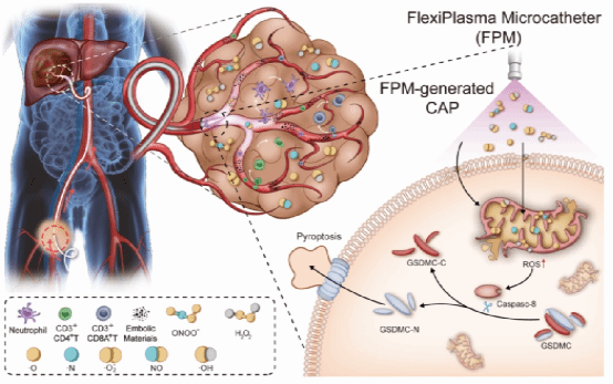 肝细胞癌(HCC)的TACE治疗常伴发病灶的转移并受到炎症干扰等限制。冷等离子体(CAP) 作为新兴电离技术则可以实现对肝脏肿瘤的选择性消融,但其仍存在组织渗透性有限的难题。中心博士生李昌红等设计并搭建了柔性微导管冷等离子体(FPM)设备。将传统的金属微针探针转换为可弯曲的非金属微管探针,可将CAP精准输送到深部肿瘤通过以降低组织损伤风险,并显著提高手术精度和安全性。此外,使用环形电极而不是传统的针形电极也可以增加自由基的产生和治疗效率,同时避免意外放电的风险,使治疗更安全、更有针对性。与传统的冷等离子体治疗机制不同,经FPM生成的CAP可屏蔽具有细胞毒性紫外线和臭氧,在细胞层面通过ROS/Caspase-8/GSDMC通路诱导肝细胞癌发生非炎症性细胞焦亡效应。由于Gasdermin-C(GSDMC)在肝细胞癌中高表达,但在正常组织中几乎不表达,这便保证了CAP治疗的选择性靶向性和以及对炎症反应的缓冲。