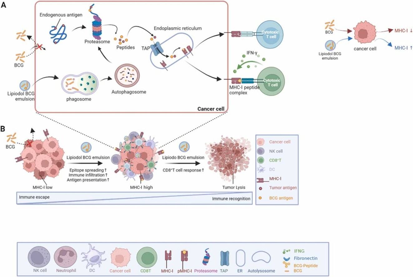 该研究提出了一种基于碘油乳化的BCG新型癌症免疫治疗策略,揭示了碘油作为药物输送载体和免疫调节的性能,证明了BCG和BCG衍生的肽段在抗肝癌应用中的潜力,这一策略也为改善卡介苗的临床应用提供了新的见解,为肝癌等实体瘤的免疫治疗提供了新思路,兼具临床转化潜力和应用前景。