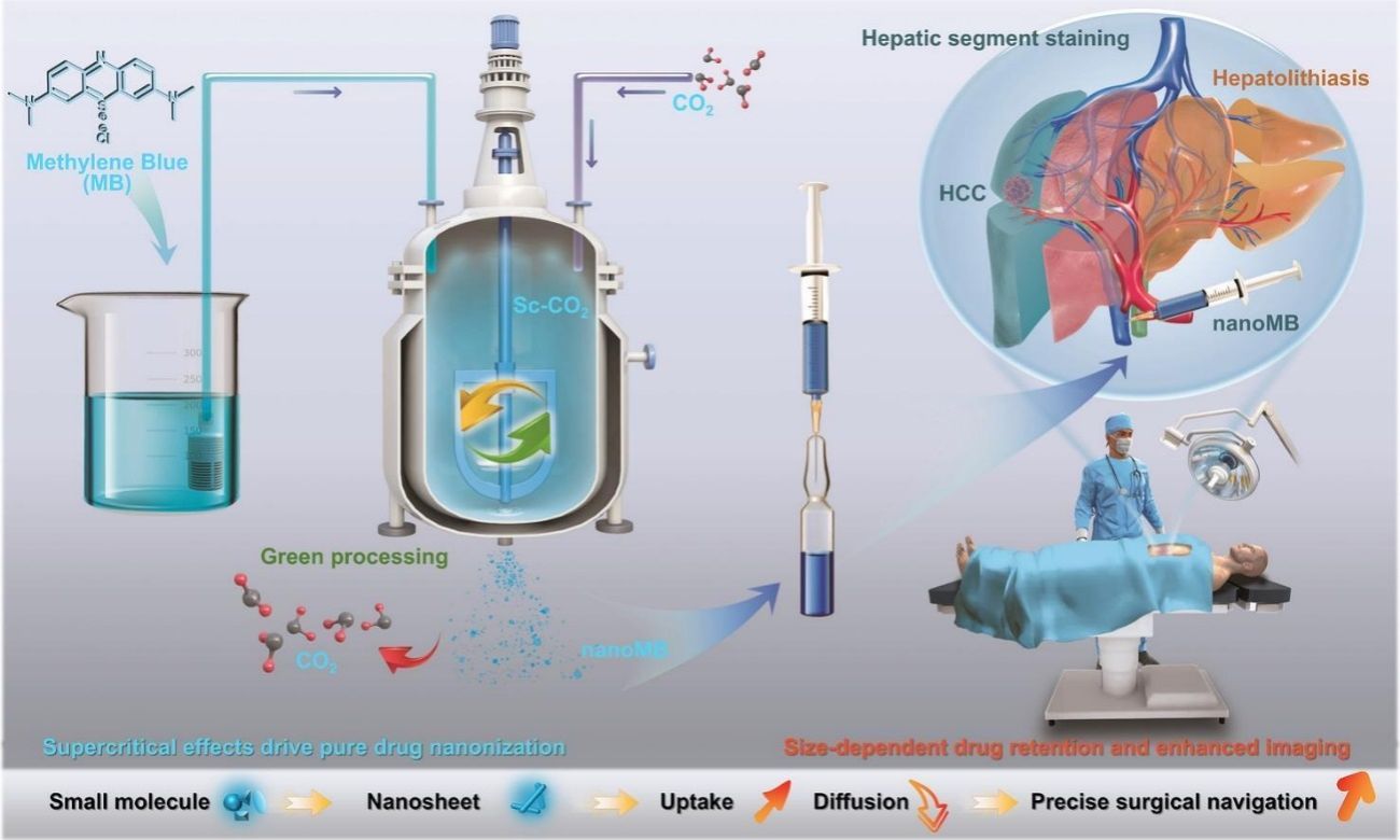 肝癌是全球严重的疾病负担,而外科手术是实现肝癌根治的有效手段。基于荧光染料的影像引导能显著改善肝癌的手术效率。然而,小分子荧光指示剂在体内代谢快,靶向性差,限制了其在肝癌诊疗中的广泛临床应用。针对这一技术瓶颈,中心刘刚教授团队多年深耕研发了基于超临界流体的纯药纳米配方技术(Eur J Nucl Med Mol Imaging. 2022,49:2605-2617; J Nanobiotechnology. 2022,20:250;Chem. Eng. J. 2023,475:146061; Theranostics. 2025,15:1017-1034)。通过精准调控制备参数,实现了小分子药物(化疗药、荧光染料等)的无载体纳米化,打造出一个绿色、高效、安全且具有巨大临床应用前景的纳米药物配制新策略,为多种药物的临床应用提供技术支撑,有望极大拓展传统小分子药物的临床应用场景。