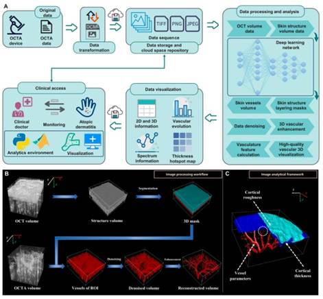 在前期的基础上,研究团队提出研一种全新的三维曲面成像处理流程,将人工智能(AI)识别算法与先进的三维去噪技术有机结合,实现皮肤微血管的高保真重建。这套流程能够自动适应皮肤表面的弯曲形态,减少伪影干扰,还原真皮层及深层微血管的真实形态,就像为医生配备了一台“立体显微镜”,能够全面捕捉病灶部位复杂的结构和血流变化。近日该研究以一种融合人工神经网络与高级三维去噪算法的“一体化三维曲面处理工作流程”,显著提升了皮肤微血管影像的精度,这项研究“Three-Dimensional Curved Workflow-Based Optical Coherence Tomography Angiography for Enhancing Atopic Dermatitis Theranostics”发表于国际学术期刊《Research》。