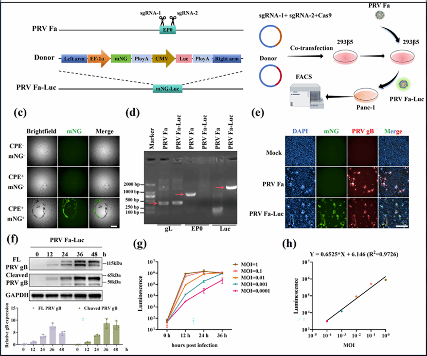 图1.重组PRV Fa-mNG-Luc的构建与鉴定