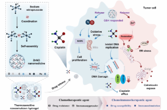 研究团队将临床已批准的心血管药物硝普钠与人体必需元素Zn⟡⁺通过自组装获得纳米制剂ZnNO。该制剂可通过双重协同机制增强顺铂的疗效:其一,在肿瘤微环境中响应谷胱甘肽(GSH)释放一氧化氮(NO),消耗GSH并放大氧化应激,从而增敏肿瘤细胞对顺铂的反应;其二,Zn⟡⁺可诱导CRT暴露、ATP释放和HMGB1易位,进而促进ICD。从机制上看,ZnNO联合顺铂能够上调ICD相关基因(如CD8a、CD8b1、Hspa1a),通过上调Fos、Rasgrf2、Tgfa及Tgf7激活MAPK信号通路,并通过下调MRP2和Slc22a1等外排蛋白的表达来克服顺铂耐药,最终将肿瘤微环境重编程为免疫刺激型生态位。