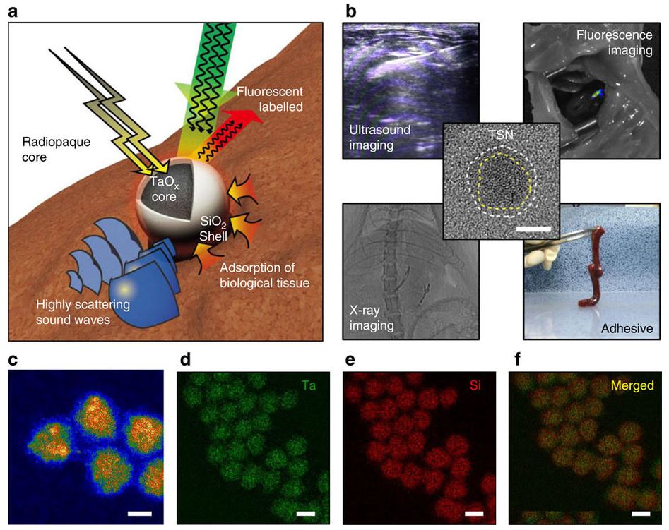 组织粘合剂作为缝合和钉扎的一种替代品,用于外科手术或创伤后伤口闭合和损伤组织的重新连接。由于这些粘合剂的方便性和有效性,特别是在微创手术中,这些粘合剂受到越来越多的关注。为了安全、准确的应用,组织粘合剂应检测通过临床影像学和有高度的生物相容性。然而,很少有粘合剂满足所有这些要求。在这里,我们表明,生物氧化钽/二氧化硅核壳纳米粒子(TSNs)不仅具有高对比度的效果,而且具有很强的粘接性能,实时成像。此外,生物相容性造成的细胞毒性和TSNs少少炎症比临床使用,成像组织粘合剂(即一个组织和Lipiodol的混合物)。由于其多功能成像和粘接性能,成功应用的TSNs作为微创手术止血胶和固定标记图像引导程序。