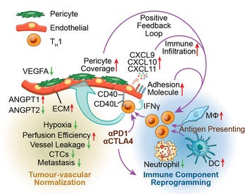 Blockade of angiogenesis can retard tumour growth, but may also paradoxically increase metastasis. This paradox may be resolved by vessel normalization, which involves increased pericyte coverage, improved tumour vessel perfusion, reduced vascular permeability, and consequently mitigated hypoxia. Although these processes alter tumour progression, their regulation is poorly understood. Here we show that type 1 T helper (TH1) cells play a crucial role in vessel normalization. Bioinformatic analyses revealed that gene expression features related to vessel normalization correlate with immunostimulatory pathways, especially T lymphocyte infiltration or activity. To delineate the causal relationship, we used various mouse models with vessel normalization or T lymphocyte deficiencies. Although disruption of vessel normalization reduced T lymphocyte infiltration as expected, reciprocal depletion or inactivation of CD4+ T lymphocytes decreased vessel normalization, indicating a mutually regulatory loop. In addition, activation of CD4+ T lymphocytes by immune checkpoint blockade increased vessel normalization. TH1 cells that secrete interferon-γ are a major population of cells associated with vessel normalization. Patient-derived xenograft tumours growing in immunodeficient mice exhibited enhanced hypoxia compared to the original tumours in immunocompetent humans, and hypoxia was reduced by adoptive TH1 transfer. Our findings elucidate an unexpected role of TH1 cells in vasculature and immune reprogramming. TH1 cells may be a marker and a determinant of both immune checkpoint blockade and anti-angiogenesis efficacy.