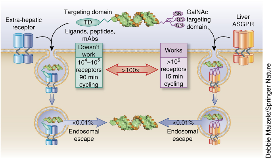 Tris-GalNAc binding to liver ASGPR (~106/hepatocyte) induces endocytosis (~15 min) where a small fraction of the siRNA or ASO cargo escapes into the cytoplasm to induce selective RNA drug responses. In contrast, targeting non-hepatic cell surface receptors (104–105) that have a much slower rate of endocytosis (~90 min) has proven extremely difficult. Assuming there is no endosomal escape advantage in ASGPR endosomes, ASGPR brings in ~100-fold more siRNAs/ASOs into hepatocytes than is mathematically possible in any other ligand–receptor pair. Consequently, development of next-generation RNA-based therapeutics needs to incorporate new chemistries, materials and/or mechanisms of enhancing endosomal escape ~100-fold.