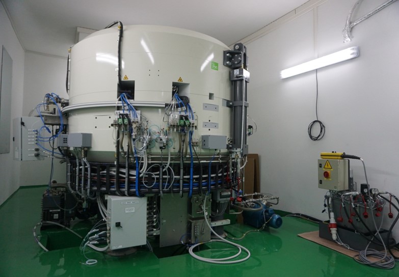 Cyclone 18/9回旋加速器质子的能量最高达18MeV,束流:150uA,独立靶位:8个,剥离系统:8个,各带2个剥离膜片。双靶双束流非对称输出技术:即相对两个靶可以从10%到90%设定不同束流输出量,可根据需要同时生产不同核素,或者同一核素优化产量。生产核素种类:18F液体,11CO2,13NH3,15O2气体,18F产率9居里/2小时[EOB]。同时配备了自动化合成模块,能够生产符合GMP标准的正电子药物FDG和FLT。