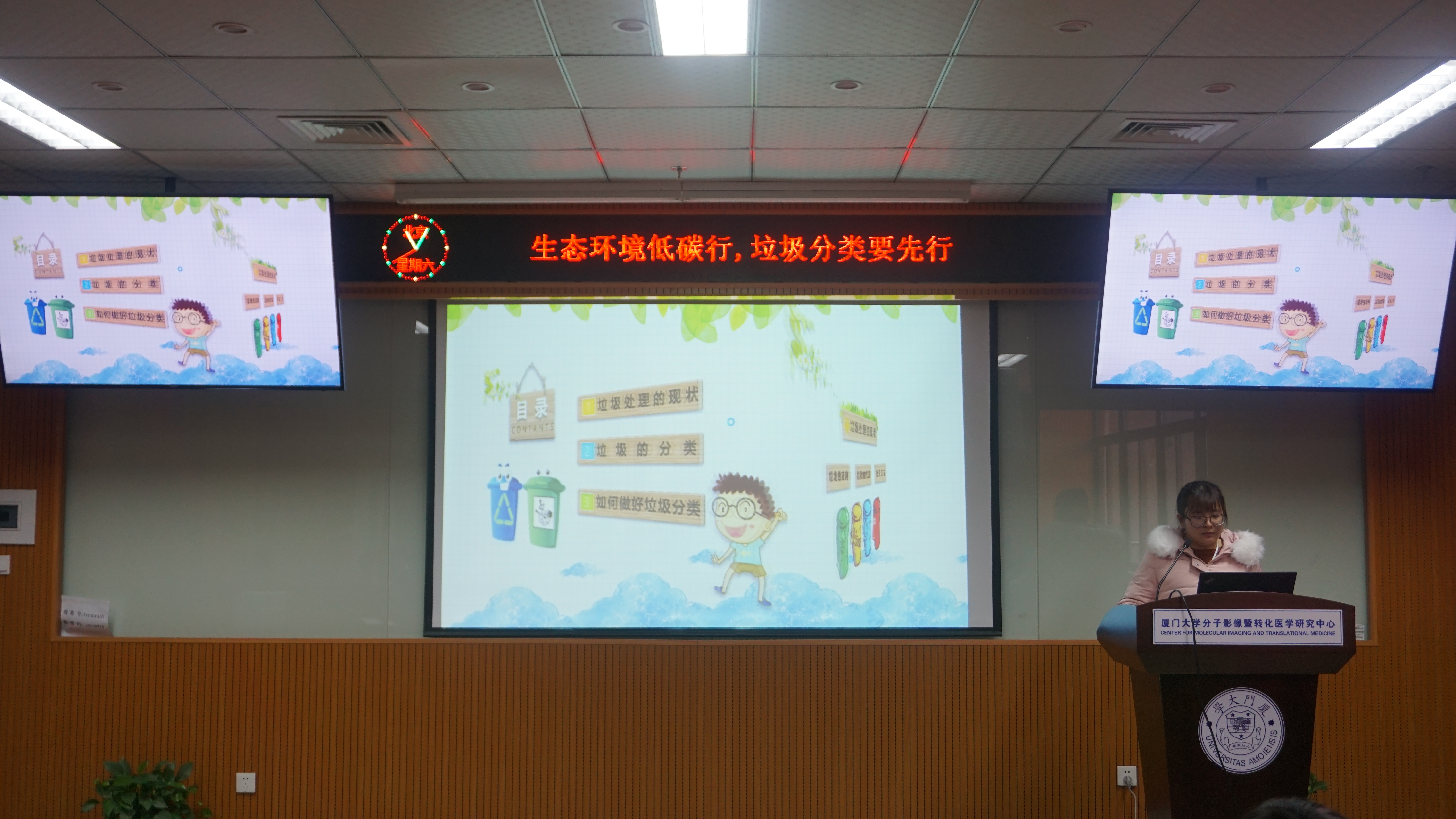 在讲座中,陈雪媛同学首先向大家介绍了垃圾分类的现状,从垃圾的去向、危害和处理等几个方面的介绍来说明了目前垃圾分类现状的严峻性和紧迫性;随后,向大家介绍了垃圾分类的基础知识,日常垃圾可分为可回收垃圾、厨余垃圾、有害垃圾和其余垃圾,而进行分类处理后,可以减少占地面积,减少环境污染,还可以变废为宝;接着,进一步详细介绍了在日常科研工作、生活中如何正确地将垃圾进行分类处理,并倡导大家日常生活中注重垃圾分类,从自身做起,养成良好的生活习惯,实现废物利用,共同为营造美丽绿色的生活环境而努力。