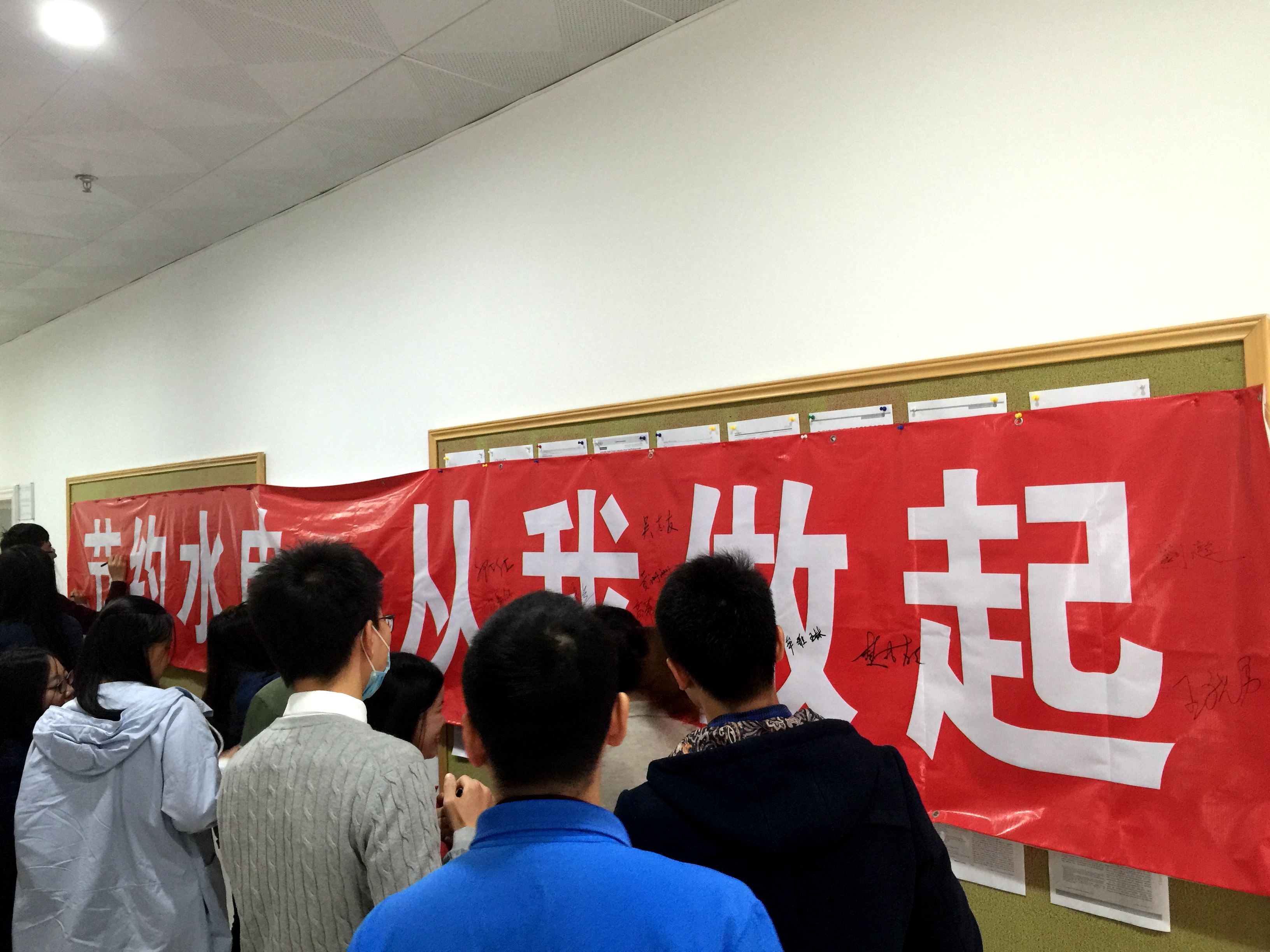 ▲ 图为中心全体师生在“节水节电,从我做起”的宣传横幅上亲笔写下“节能减排”宣言
