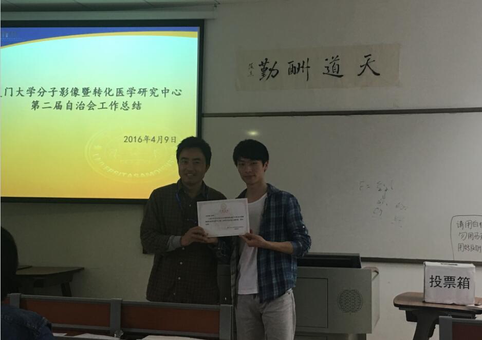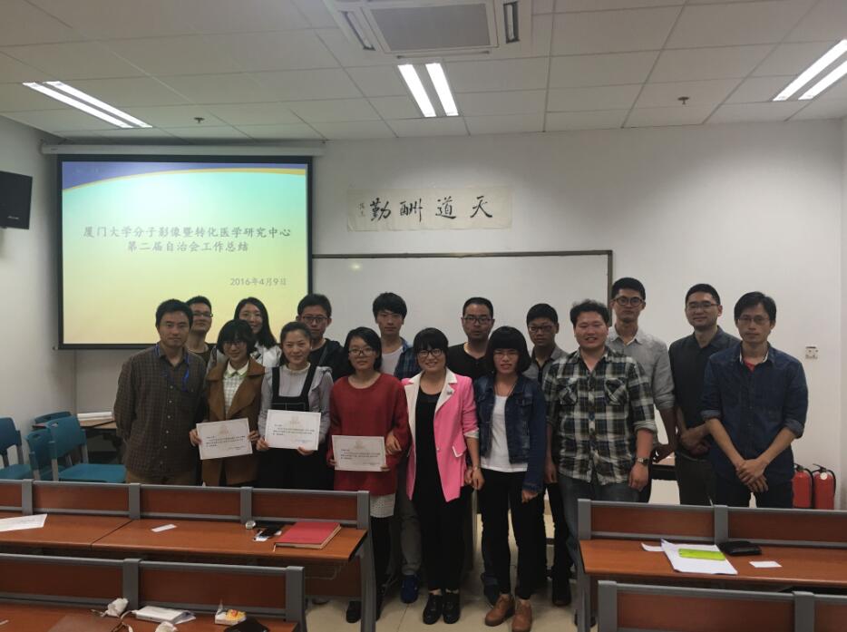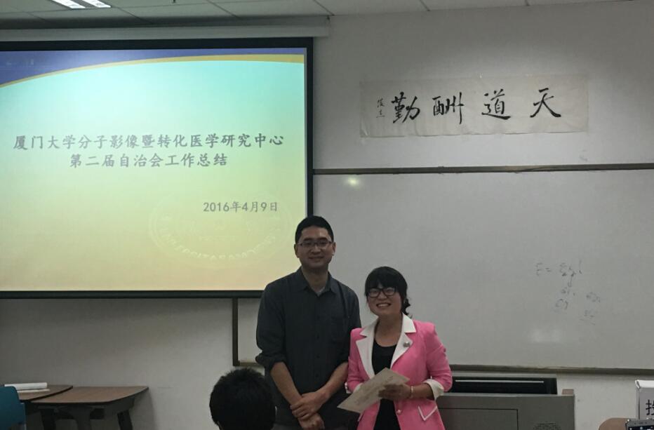 2016年4月9日星期六上午9:00,中心正常召开每周一次的大组会,在日常组会汇报结束后,中心第二届学生自治会的主席付贵峰同学对一年来自治会的工作进行了总结。分子影像中心自治会机构设置为主席、学术部和生活部。对中心日常科研、学术和生活等方面为广大同学和老师服务,并做好各项监督工作。付贵峰首先感谢了第一届学生自治会同学的奉献,他们给下一届同学留下了很多宝贵的经验。在这些经验的基础上,第二届自治会同学进行了拓展和丰富,制定了更为详尽的各项管理制度,包括卫生考评制度、考勤制度、组会汇报制度等。当然,他也提出了自治会工作所存在的不足之处,比如大组会出席情况等有待改进的地方,并希望下一届自治会的同学在继续开展中心日常工作的同时可以提高这些不足之处。最后,付贵峰同学介绍了去年一年中心举办的文体活动,丰富了广大师生的科研之余的生活,也希望新一届的自治会同学可以继续秉承优良传统,延续自治会的精彩工作。